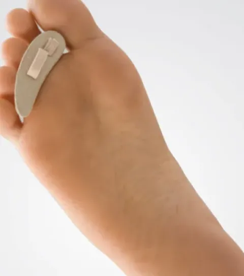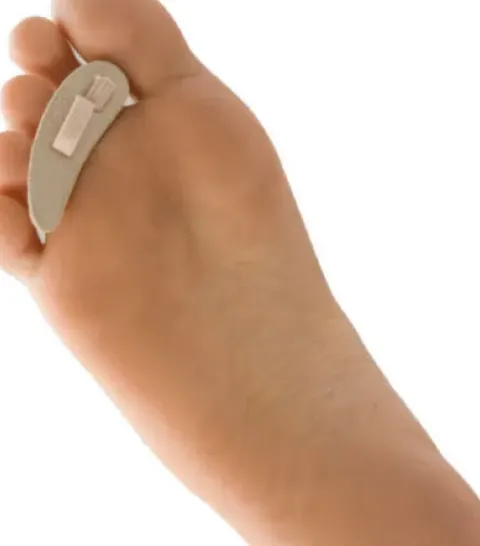 Mittels der Schlaufe korrigiert es sanft die Fehlstellung von Hammerzehen, während das weiche Kissen die Zehen von unten stützt.