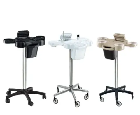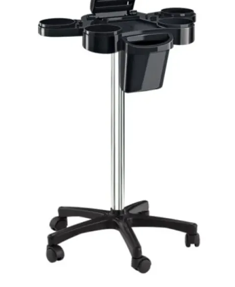Technischer Arbeitswagen mit vier abnehmbaren Schalen, Steckplätzen für Kämme und Bürsten und eingebautem Folienschneider. Aus Farbabweisendem Material. Auch mit Aluminiumfuss erhältlich.