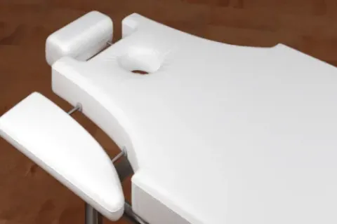Verdeckt durch das sanfte, hautfreundliche Kunstleder, im Innern der Liege der Ergotherm-Schaumstoff, der sich während der Behandlung ergonomisch an den Körper anpasst, mit integrierter, zweistufiger Liegenheizung.