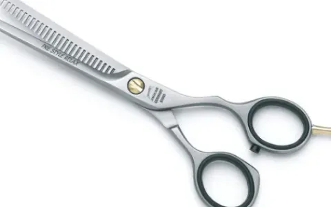 Professionelle Modellierschere aus rostfreiem Stahl, mit 28 mikroverzahnten Zähnen, mattes Finish und ergonomische Griffstellung mit kurzem Daumengriff für entspanntes Arbeiten.