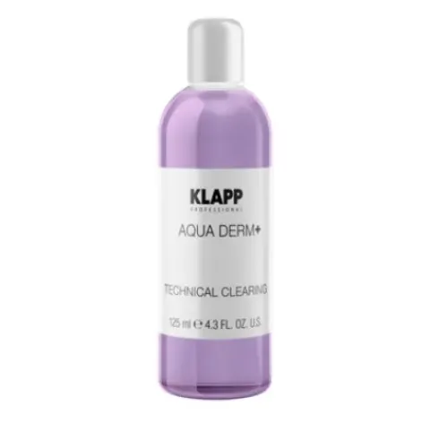 Flasche mit Reinigungslösung in die entsprechende Vorrichtung der AQUA DERM+ eindrehen. Das Vakuumhandstück während des Reinigungsvorgangs in der dafür vorgesehenen Vorrichtung stecken lassen. Vakuum und Fluidzufuhr auf höchste Stufe stellen. 2 Minuten das Technical Clearing durch das Gerät durchlaufen lassen.